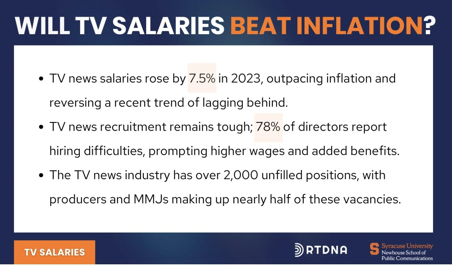 The RTDNA writes, “After two critical years of falling well behind inflation, TV news salaries made up a fair amount of that shortfall. The latest RTDNA/Newhouse School at Syracuse University Survey found that local television news salaries rose by 7.5% in 2023. That is ahead of the last couple years, and well ahead of inflation, which was up 3.1% in 2023. That means real TV news wages rose by 4.4% in 2023.”