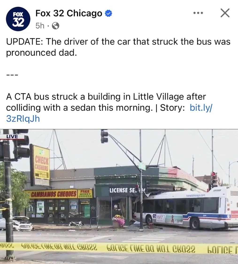 Up at WFLD in Chicago, the digital team says that the driver of a car that struck a Chicago Transit bus was “pronounced dad.”