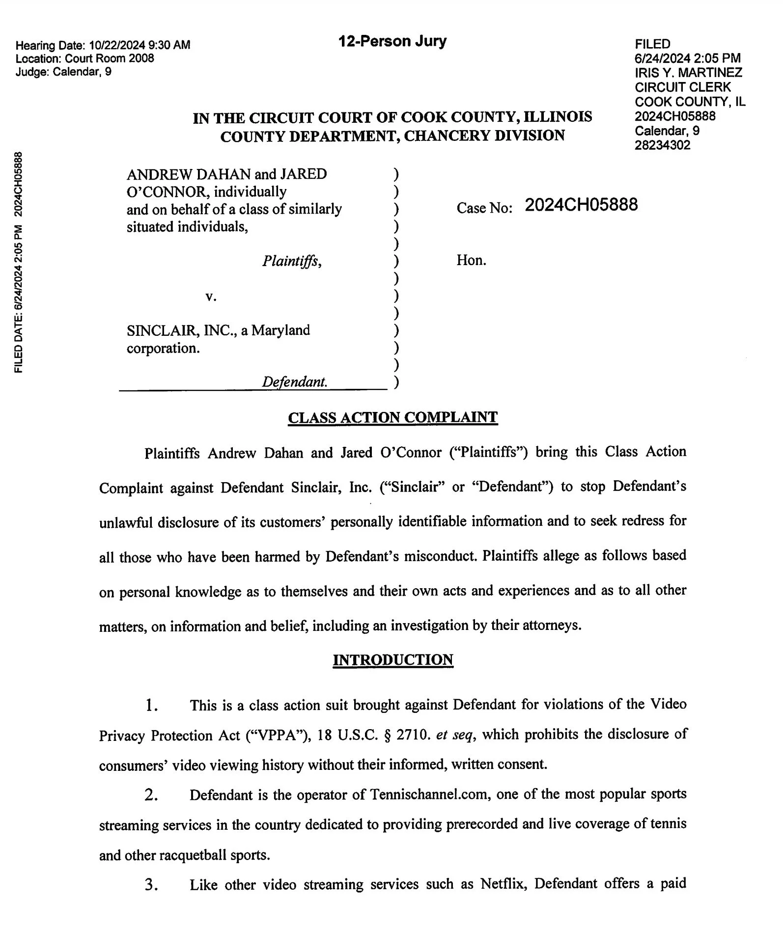 /A class action lawsuit claims Sinclair has illegally and knowingly shared with third parties, including Google, the personal data of TennisChannel.com subscribers, without consent.