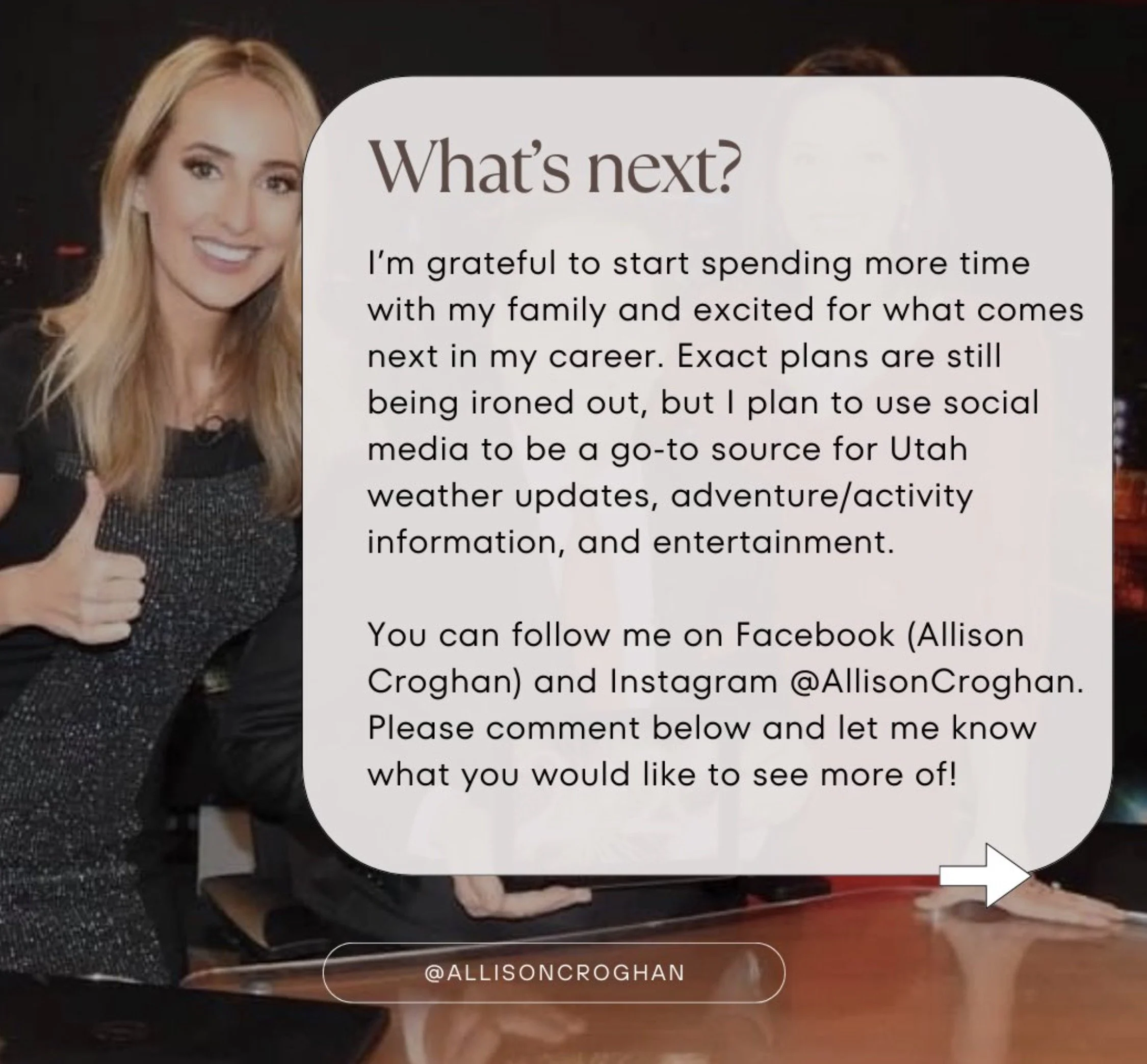 KSTU (Salt Lake City) Weather Anchor Allison Croghan announced that she is leaving the Scripps station to become a social media influencer.