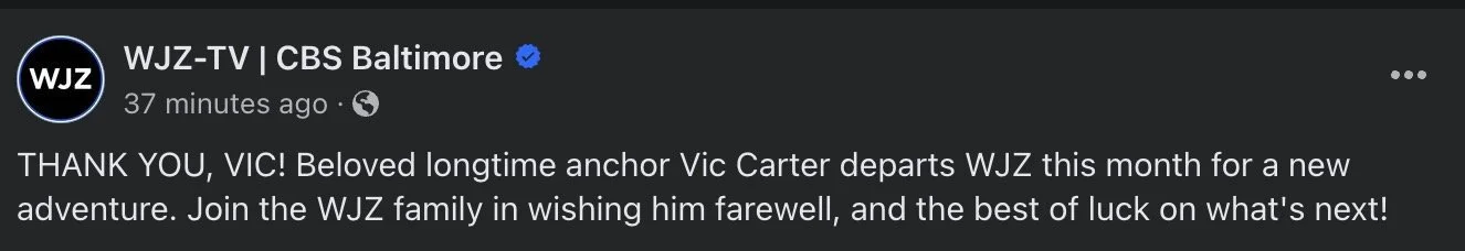 We told our email subscribers that CBS’s WJZ would be announcing that longtime Anchor Vic Carter is leaving the station after more than 3 decades.
