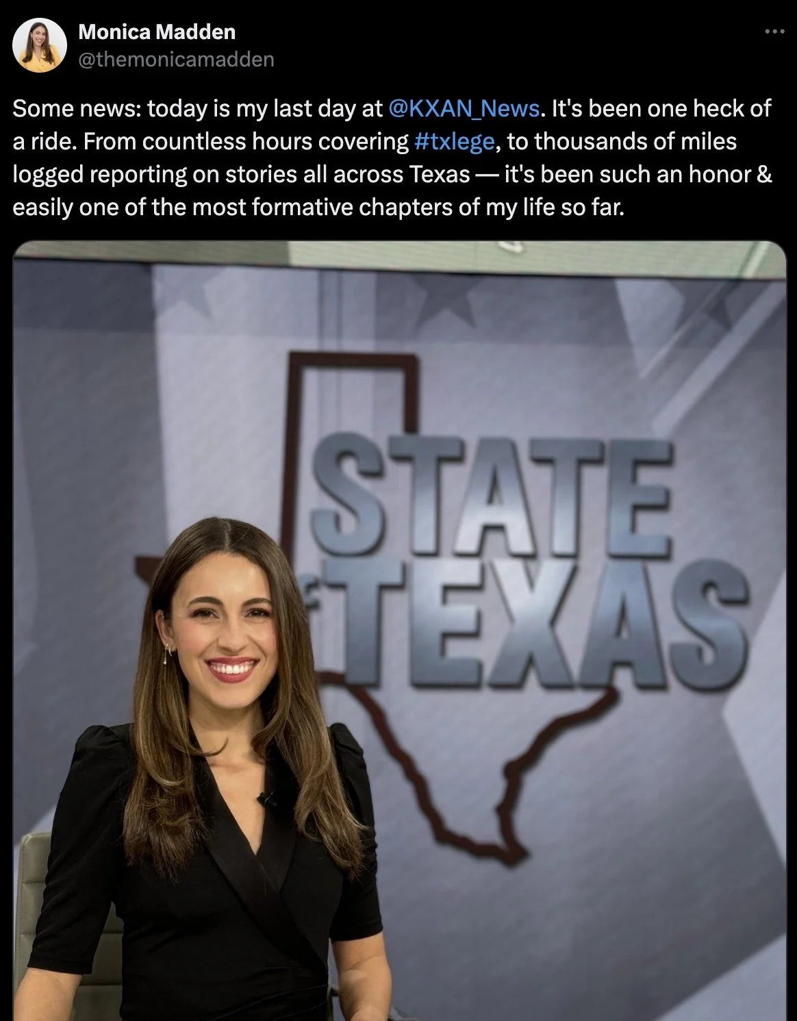 KXAN Capitol correspondent Monica Madden is wrapping up her time at the Nexstar station this weekend.