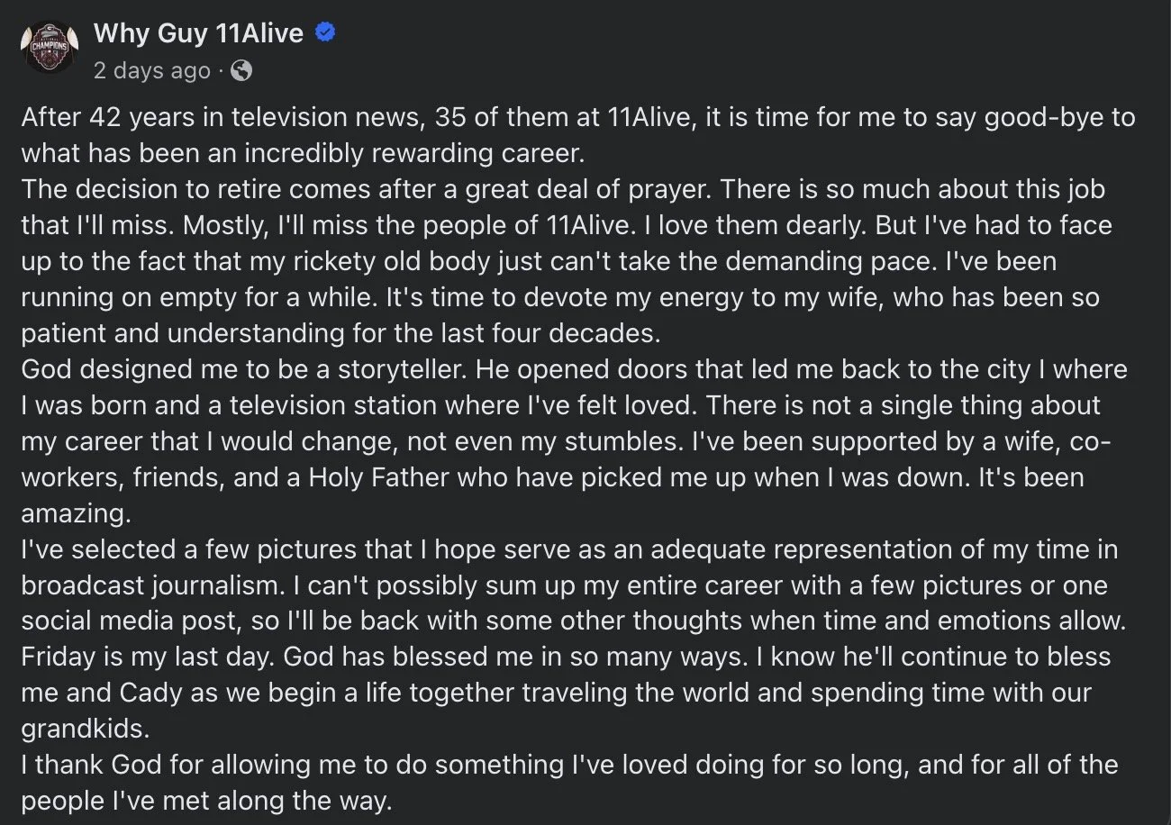 “The decision to retire comes after a great deal of prayer,” Carnes wrote on Facebook. “There is so much about this job that I’ll miss. Mostly, I’ll miss the people of 11Alive. I love them dearly. But I’ve had to face up to the fact that my rickety old body just can’t take the demanding pace.”