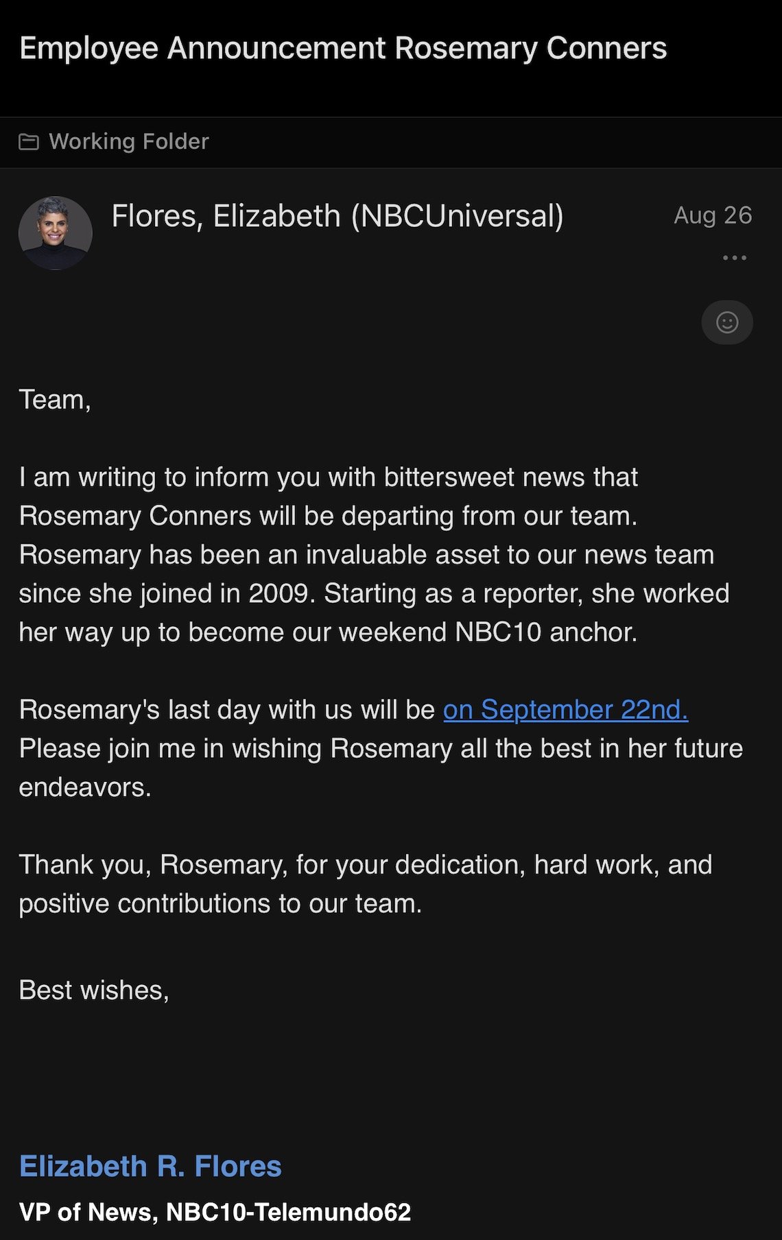/WCAU (Philly) Anchor Rosemary Connors had been with the NBC O&O for 15 years.