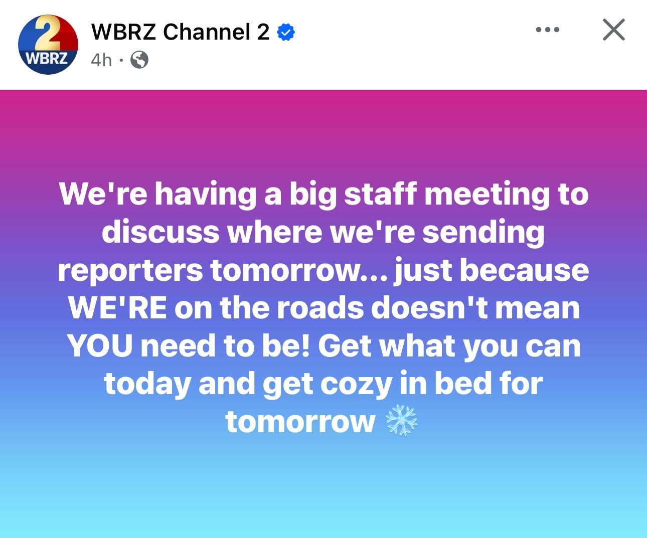 /WBRZ (Baton Rouge) is getting ready to cover the big snowstorm and they are telling viewers to stay home, while they head out on the slick roads.