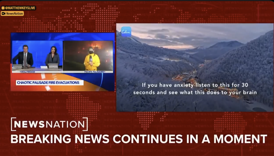 /Nexstar’s News Nation broke into programing and put up the live feed from KTLA covering the wildfires. In the split screen, News Nation continued to run their programing, including the commercials.