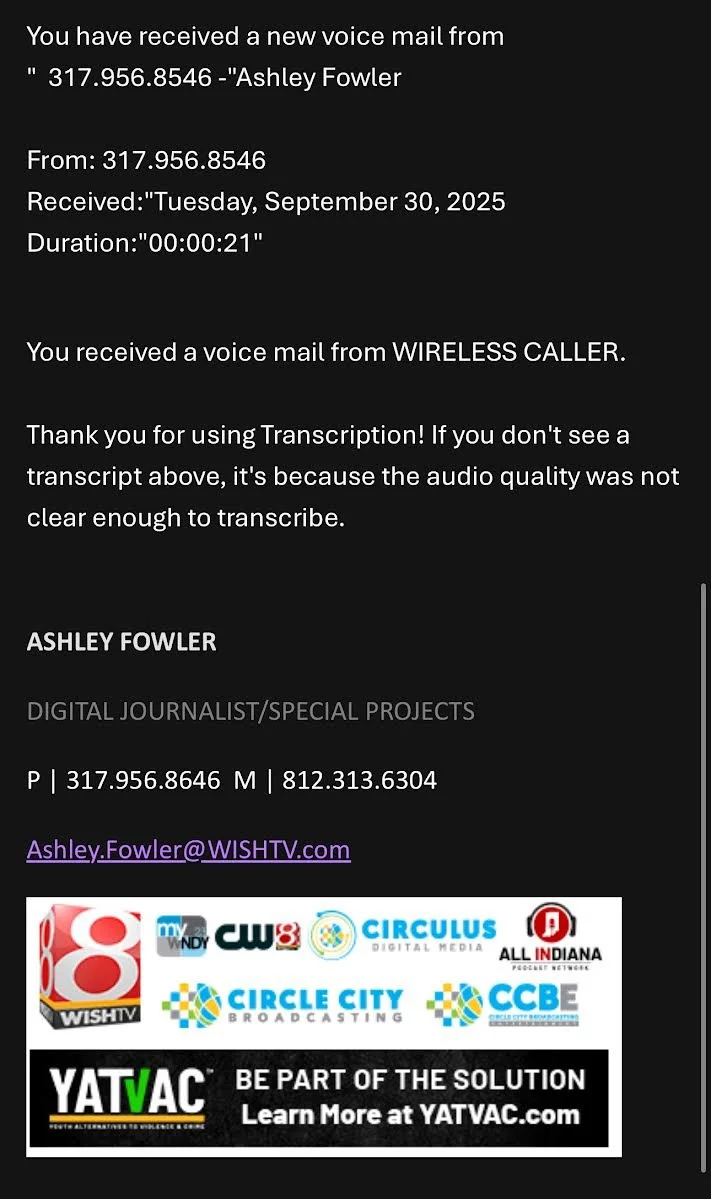 The email that looked like a voicemail from a WISH-TV reporter, but it was a phishing scam email. It appears that WISH’s IT/emails have been hacked or compromised.