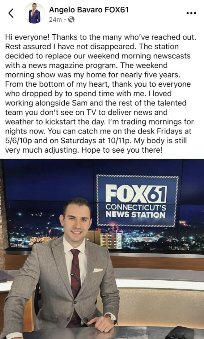 In a social media post from Anchor Angelo Bavaro, he explained that the station had eliminated the weekend morning newscast.