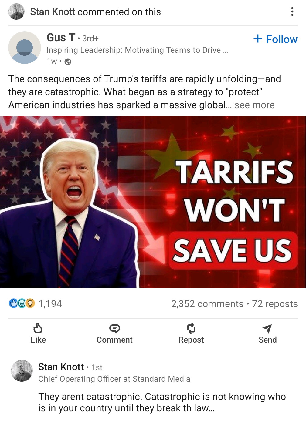 But, I guess it gives other Journalists at Standard Media stations a free pass to give their personal opinions on politics as well. But, I guess you better stay on Trump’s side where Stan is.
