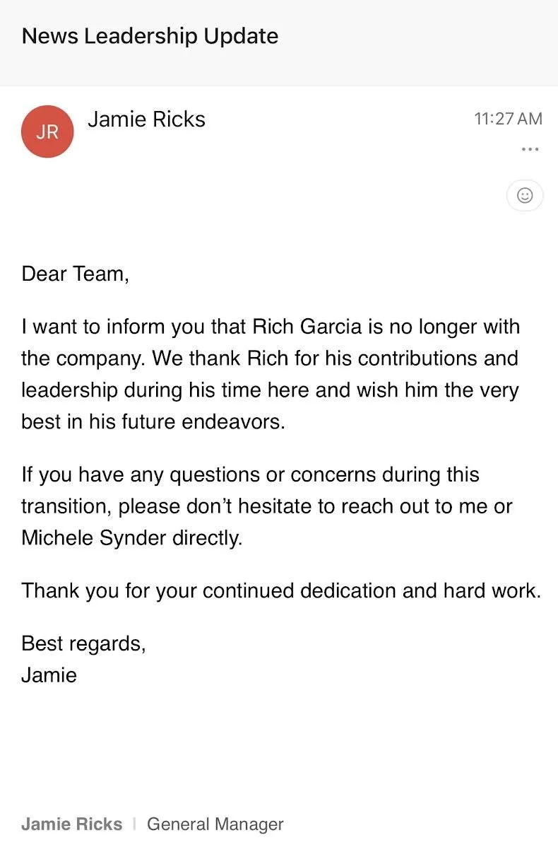 A memo went out to the staff, informing them that Rich Garcia is no longer with the station.