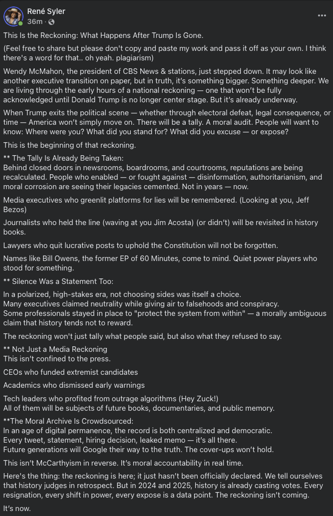 /With 60 Minutes Executive Producer Bill Owens quitting his job due to Trump and the meddling of his bosses at Paramount, and now CBS News President Wendy McMahon leaving the network, due to tensions with Trump, former CBS Morning News host Rene Syler weighed in with her thoughts.