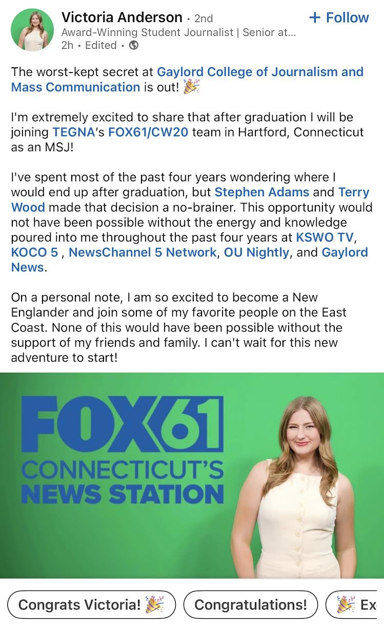 Victoria Anderson hasn’t even graduated from college yet and she has already landed a job in a top 40 market.