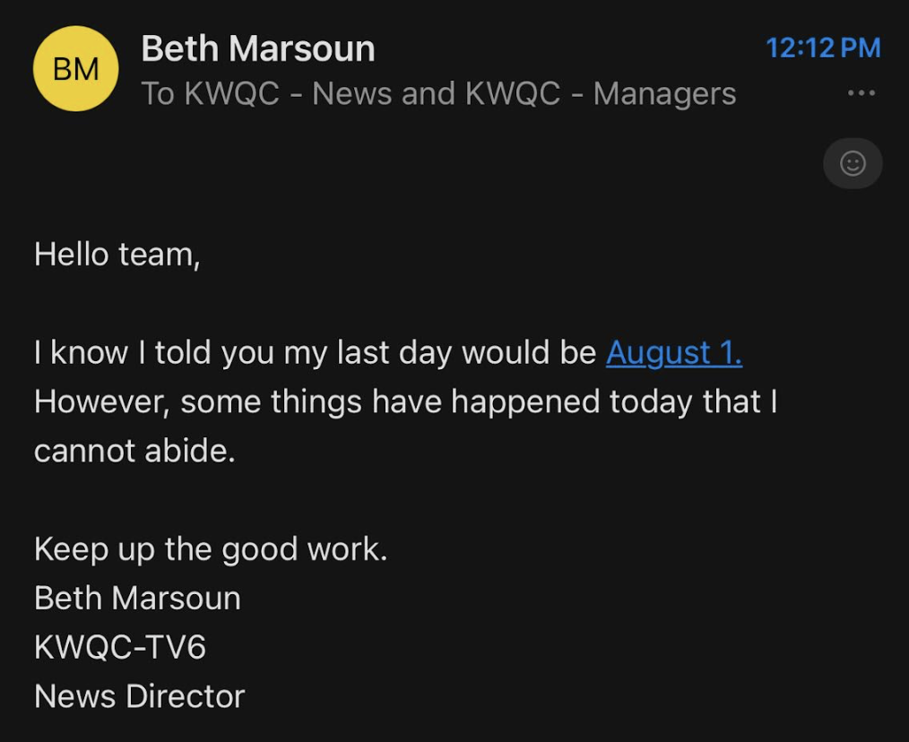 “KWQC will now be looking for its third news director in a year after the previous one before Marsoun got demoted last summer…” said one station insider.