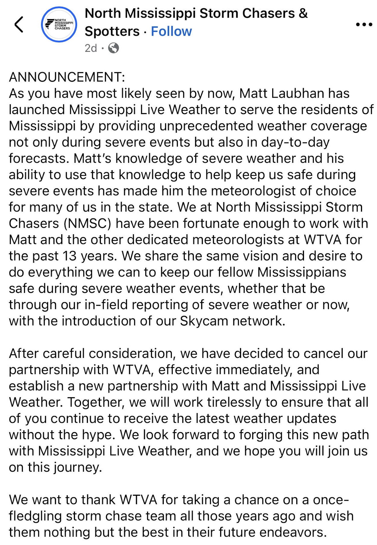 The North Mississippi Storm Chasers and Spotters had a partnership with WTVA. But the group issues this announcement, saying they are ending the partnership and going with Laubhan’s new company.