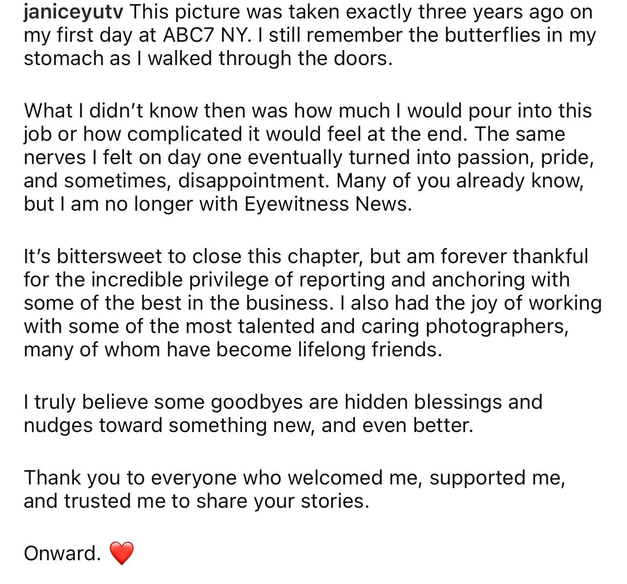 /People in the WABC newsroom and others in the NYC market are confused and surprised by the news that Anchor/Reporter Janice Yu is gone from the station after just 3 years.