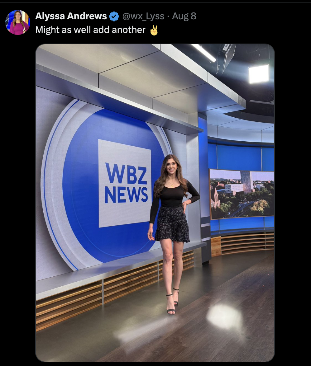 On Friday, WBZ (Boston) Meteorologist Alyssa Andrews posted this photo of her posing in the studio. No weather information, in fact no information at all. Just her, leg propped out, hoping viewers will comment on how pretty she looks.