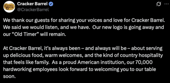 But the saddest part of this story? Cracker Barrel caved. The company announced it would be changing the logo back. So, in the span of a few days, we not only witnessed hypocrisy at the highest level, but we then saw a spineless corporation cave to the loudest voices.