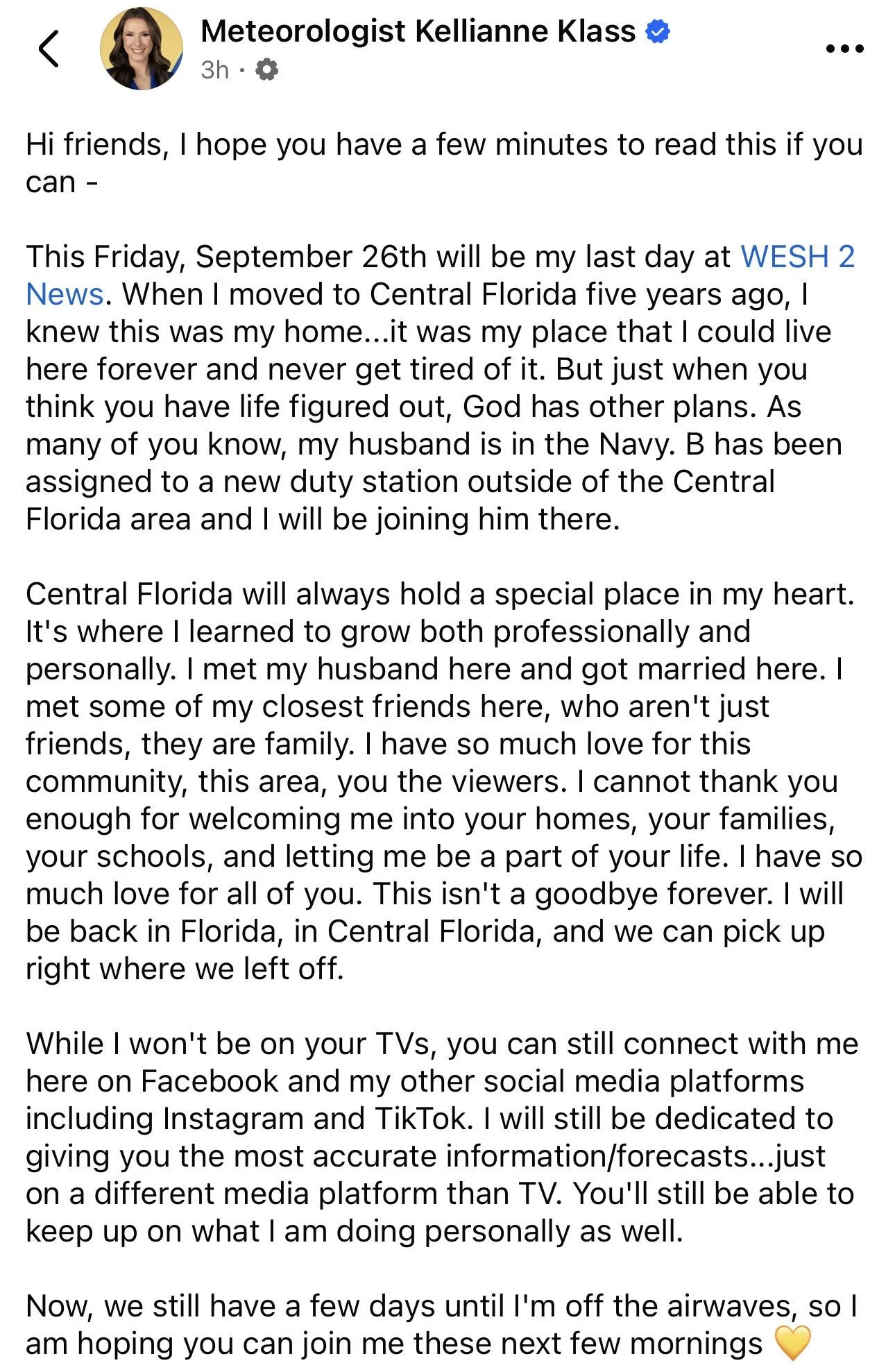 This is the last week for WESH (Orlando) Meteorologist Kellianne Klass.