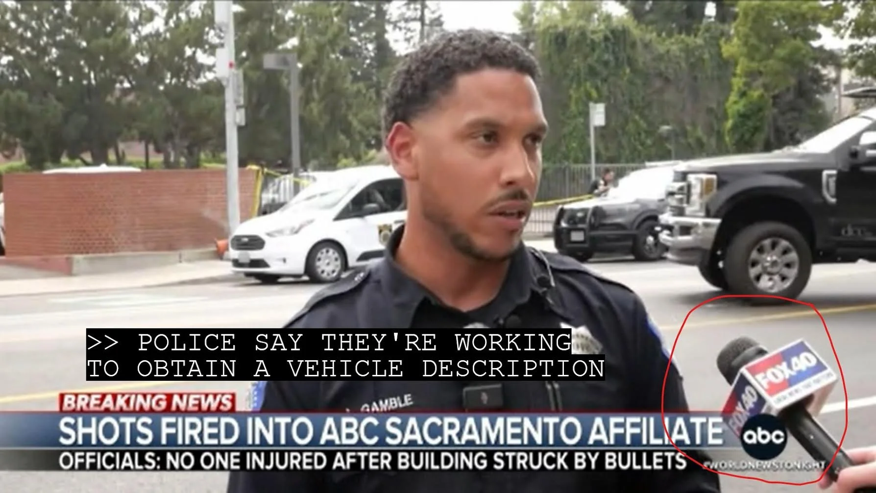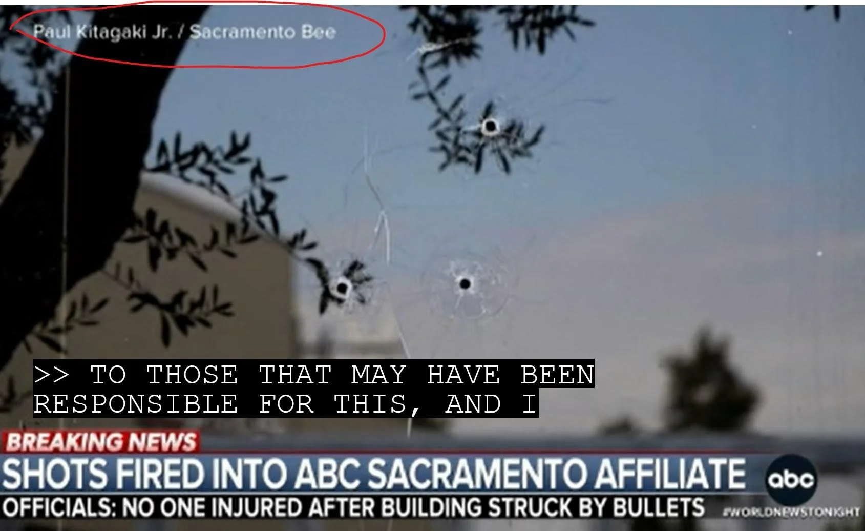 Other stations in town reported the story before the Tegna station did. KXTV is an ABC affiliate, and when ABC News covered the story, they used sound from the Nexstar station in town and pictures of the bullet holes from the local paper.