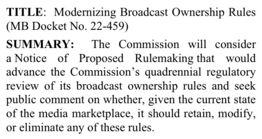 /Tomorrow, the FCC will be meeting to review of its broadcast ownership rules and seek public comment on whether, given the current state of the media marketplace, it should retain, modify, or eliminate any of these rules.