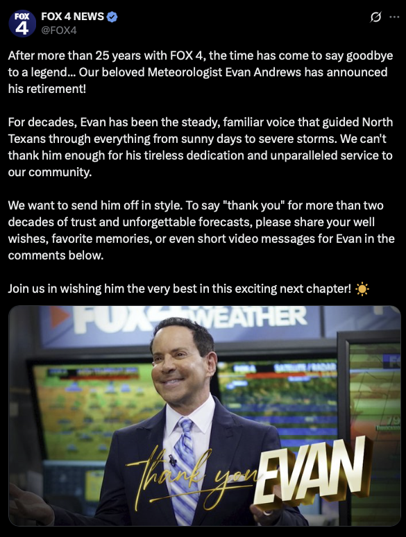 Longtime KDFW Meteorologist Evan Andrews is leaving The Firm’s station after 25 years.