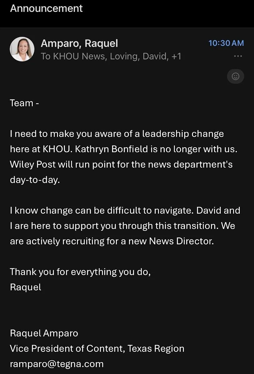 Bonfield barely made it a year at her latest job at Tegna’s KHOU in Houston. She joined the station in December of 2024, not even 11 months later, she was escorted out of the building.