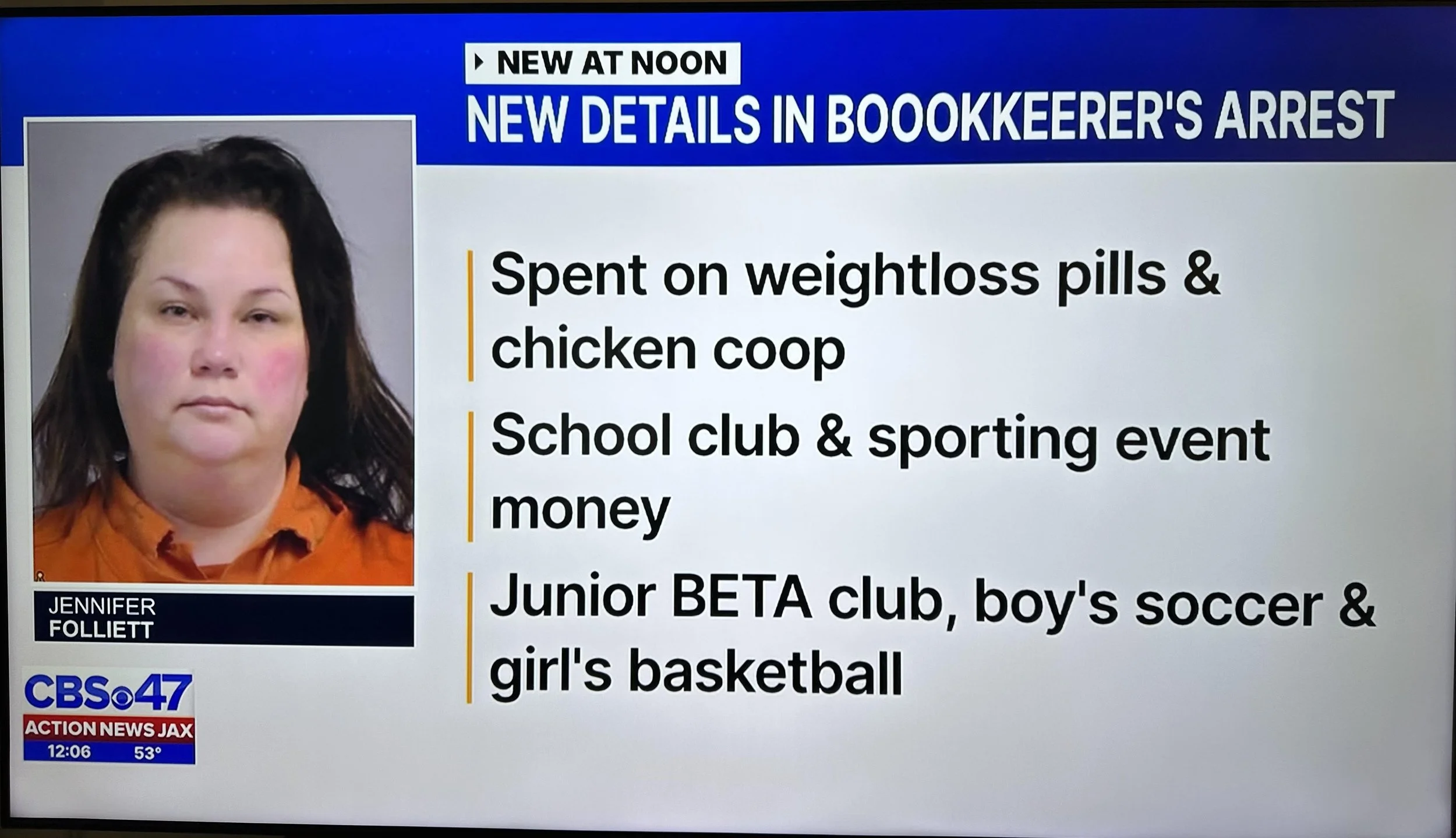/According to Cox owned WJAX, a “BOOOKKEERER” was arrested for stealing money from a local school district.
