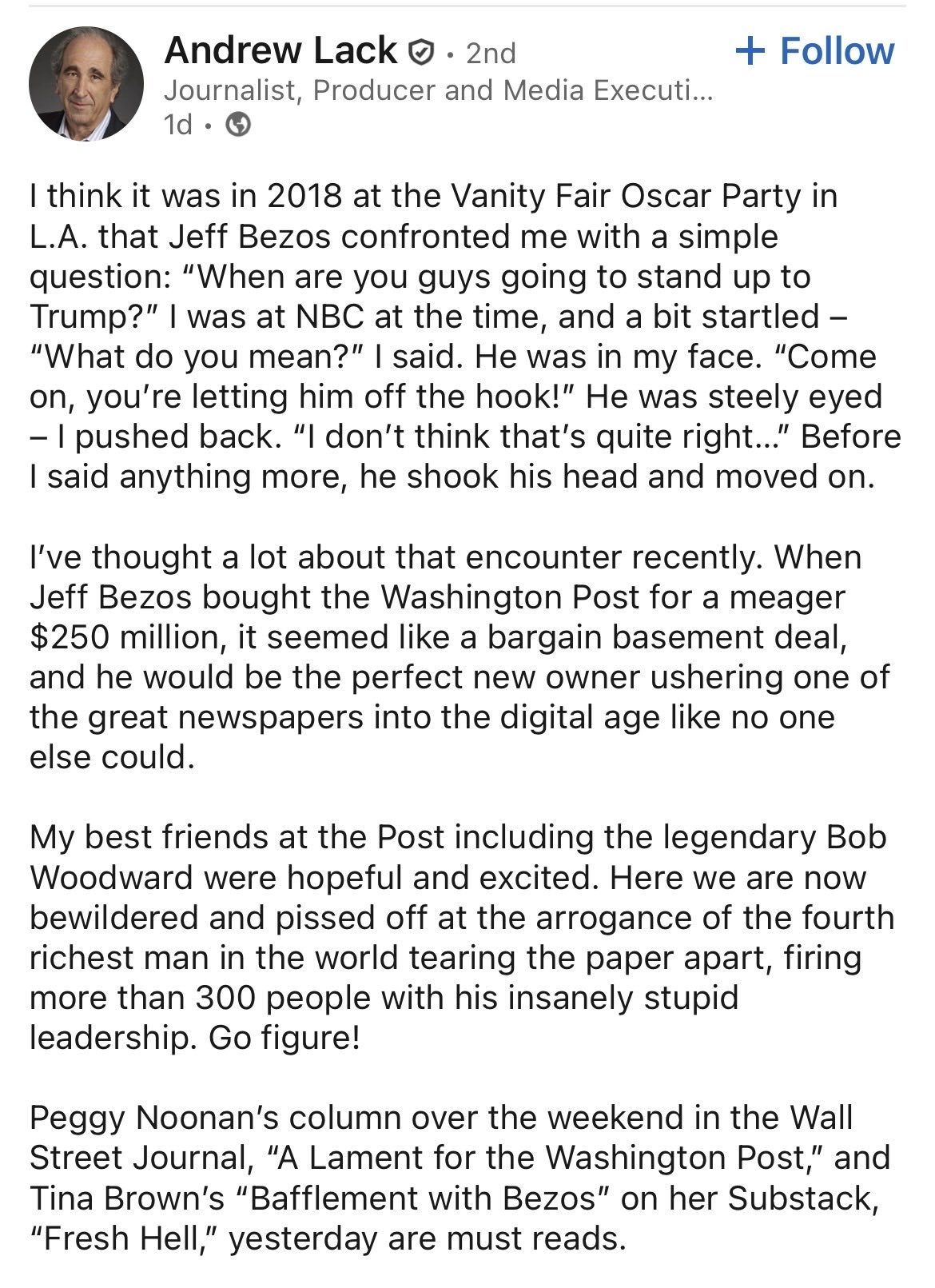 /Andy Lack was the Chairmen of NBC News back in 2018 when he was approached by Jeff Bezos, making demands that NBC stand up to Donald Trump.