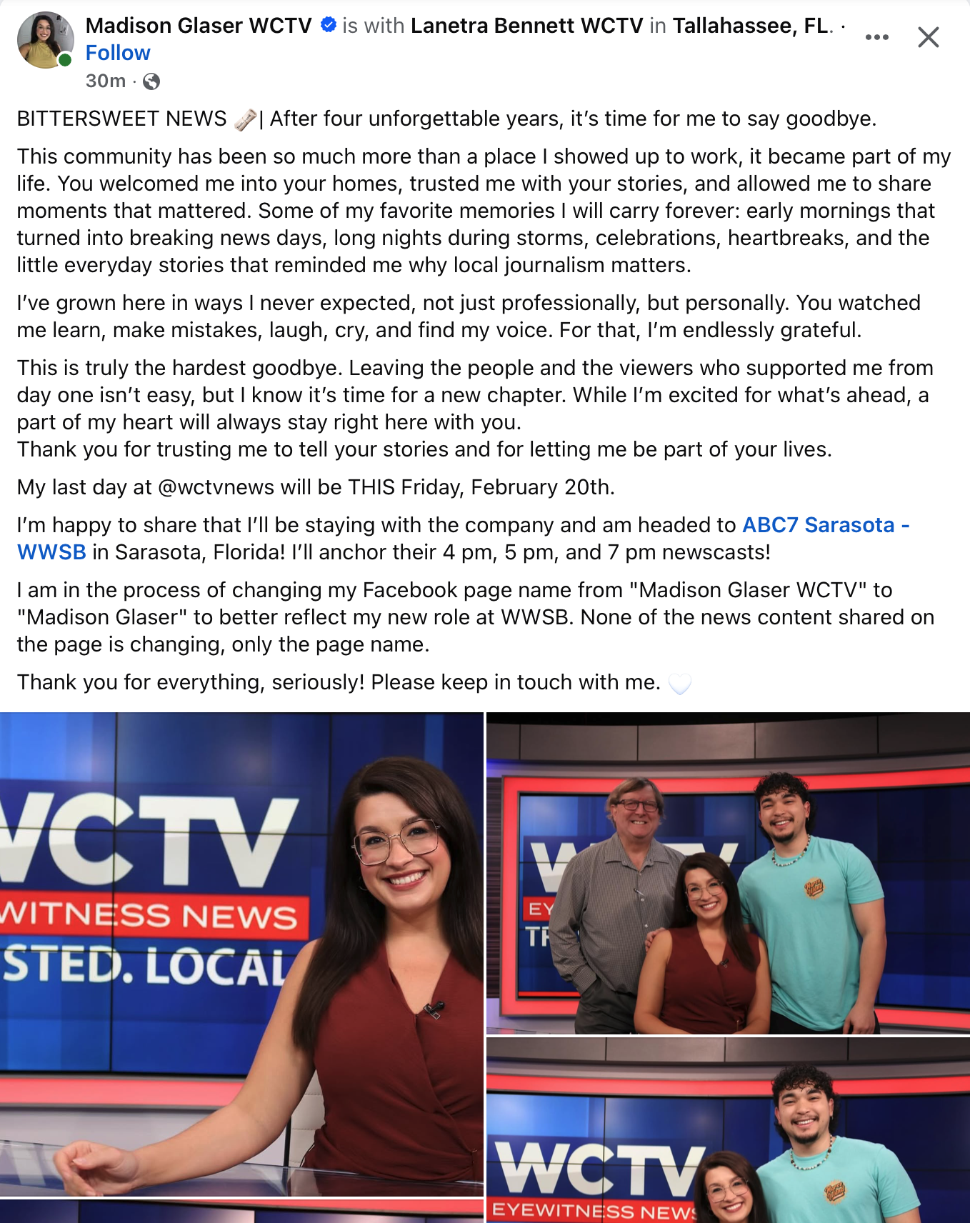 Glaser posted she’s moving south to Sarasota to work at a Gray Sister station.