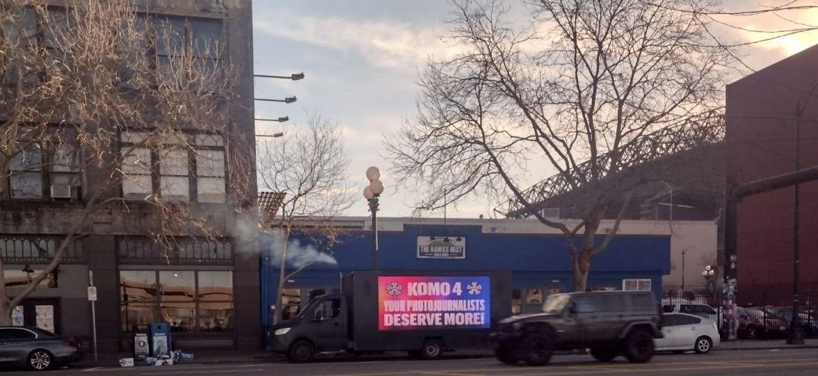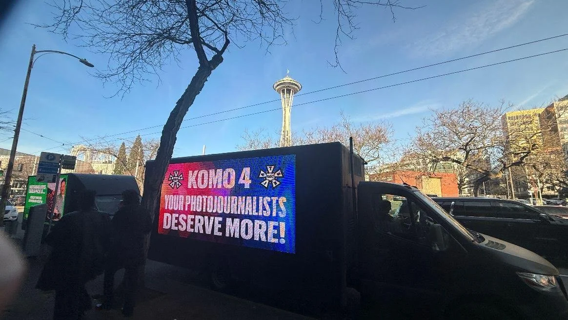 A sign truck was driving around the parade route urging Sinclair owned KOMO to treat the station’s Photographers better.