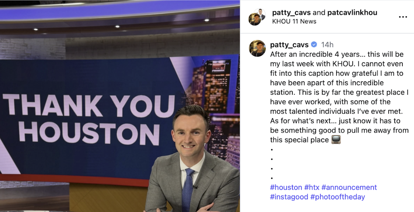 /KHOU (Houston) Meteorologist Pat Cavlin is leaving the Tegna station just before Nexstar takes over.