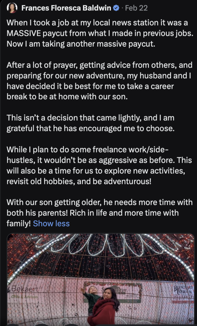/Frances Floresca worked as a Reporter at Nexstar’s WJBF in Augusta. Just 6 months into the job, she says that she has decided to quit and stay at home.