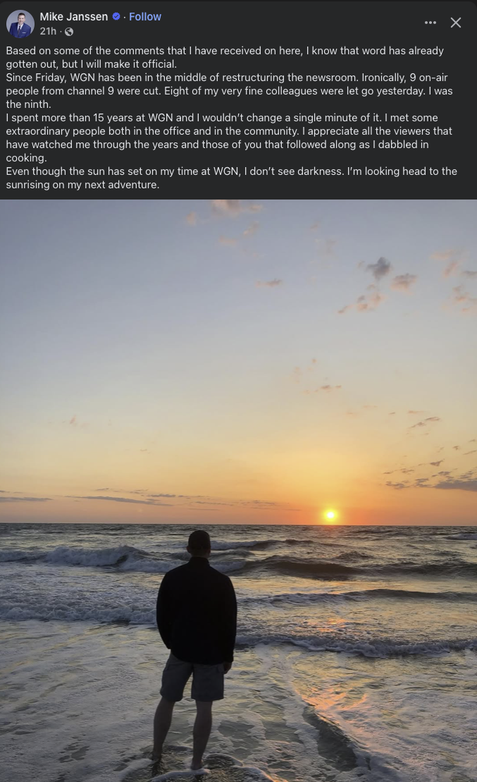 /Earlier this week, FTVLive told you that Nexstar had parted ways with longtime WGN Meteorologist Mike Janssen. Janssen was one of nine on-air Talent at WGN who were kicked to the curb by Nexstar in a cost-cutting move.