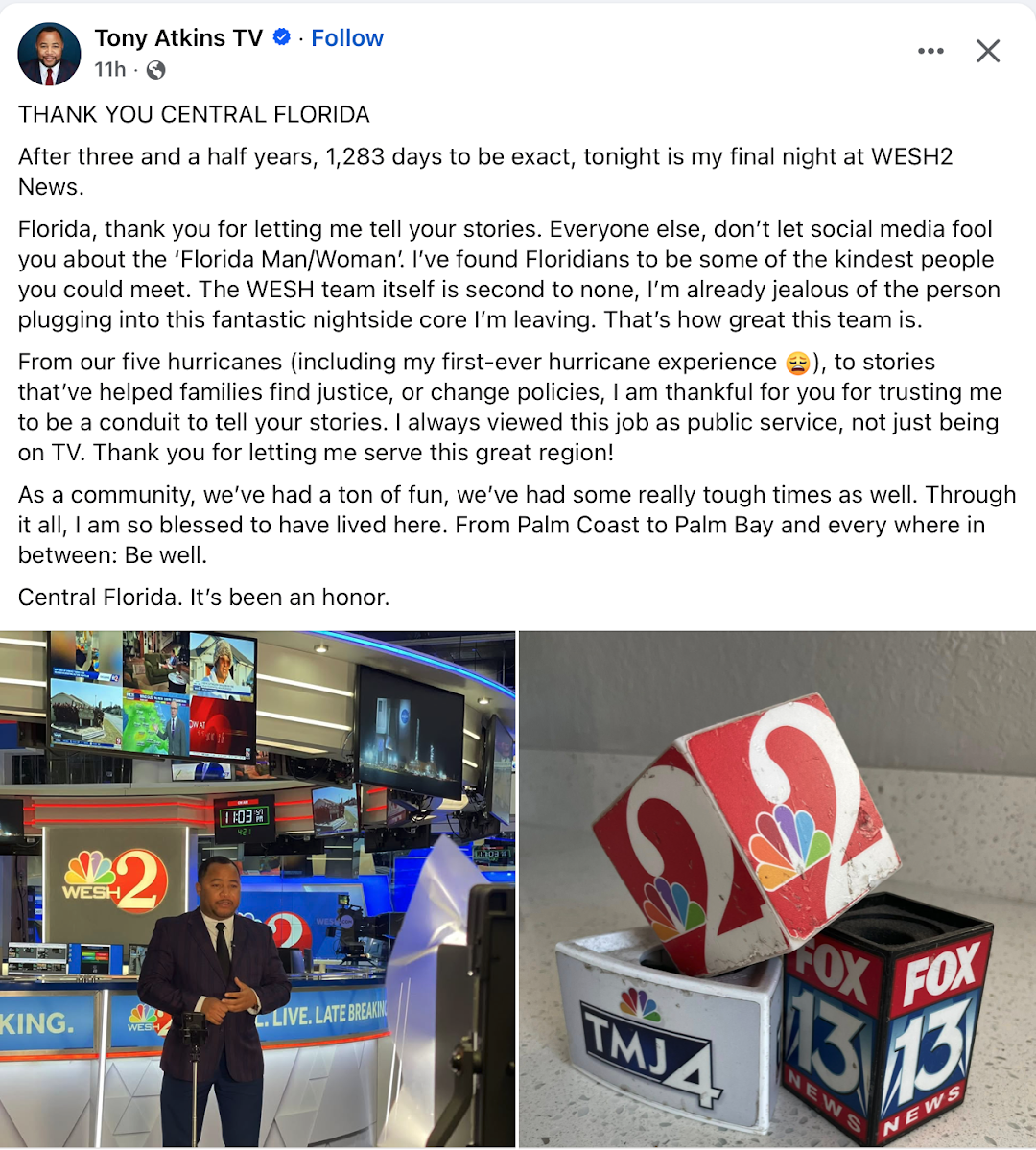 After 3 years plus, WESH (Orlando) Reporter Tony Atkins says his time at the Hearst station is over.