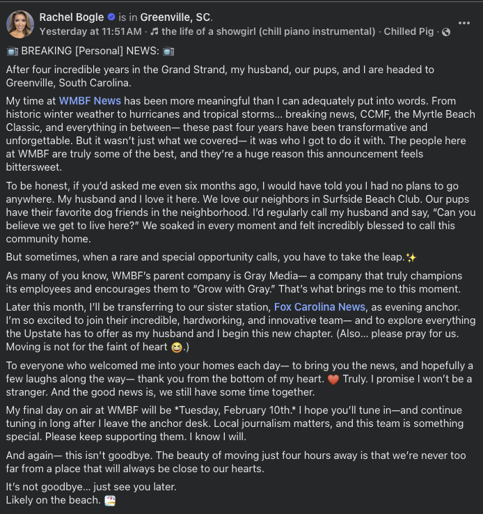 Bogle posted that she is moving to Gray’s WHNS in Greenville.