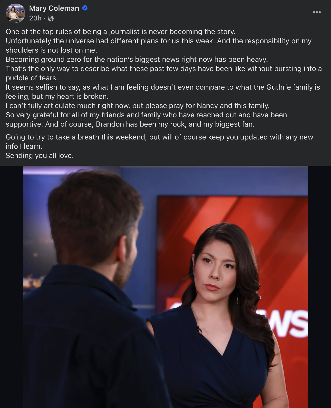 Coleman and her station, like all the other local stations have been covering the Guthrie story and all the developments.