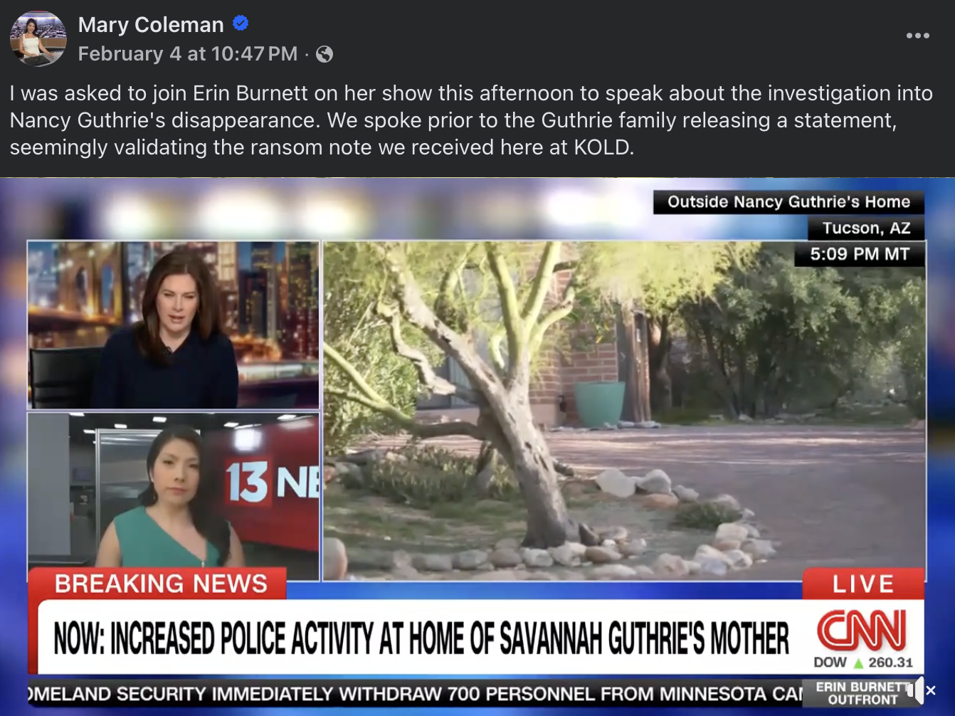 /Speaking of the Nancy Guthrie story, let’s turn to the social media posts of KOLD (Tucson) Anchor Mary Coleman.