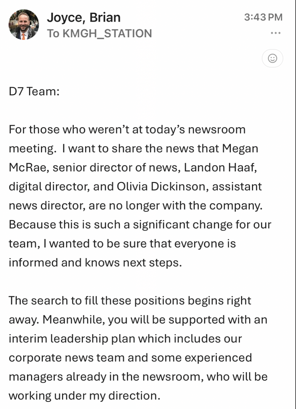 Here is the internal email, obtained by FTVLive for KMGH GM Brian Joyce.