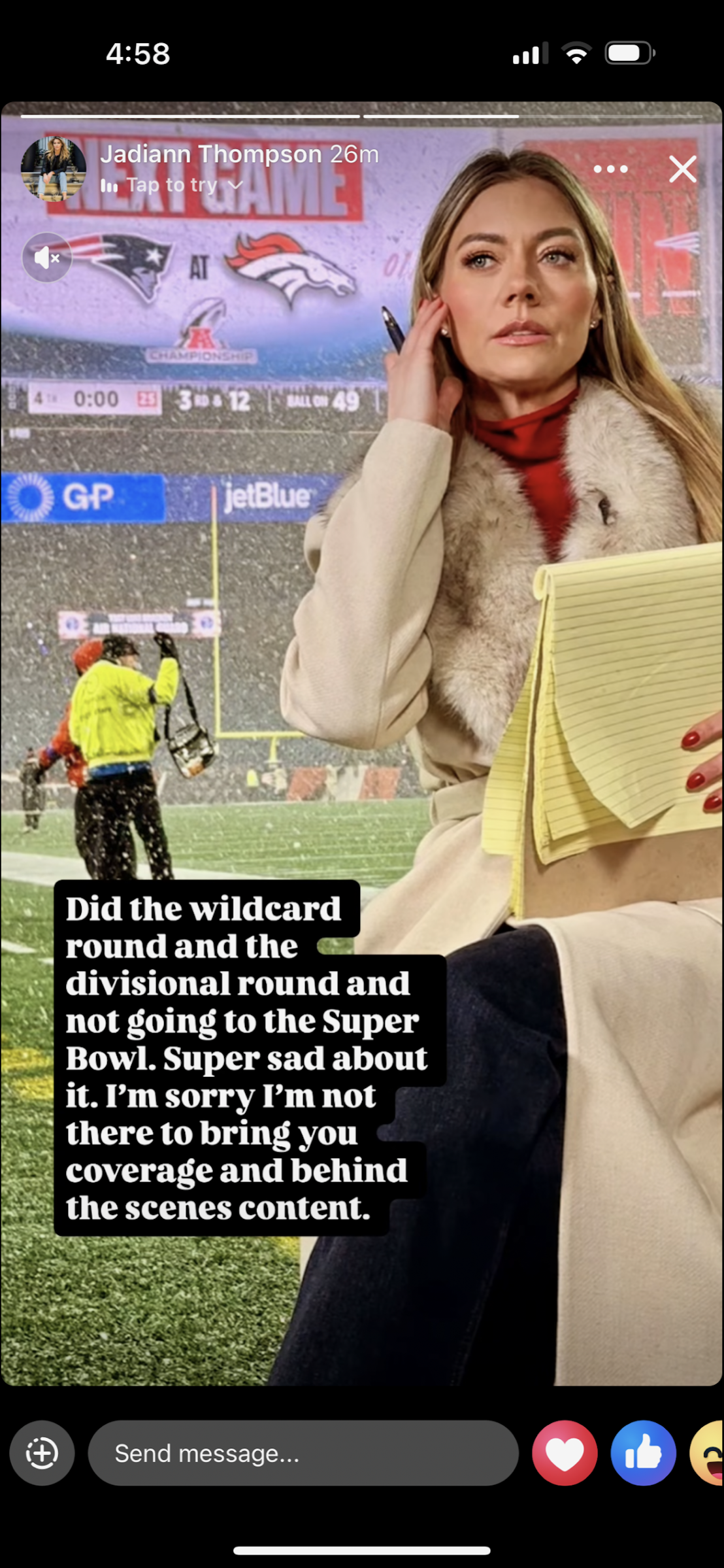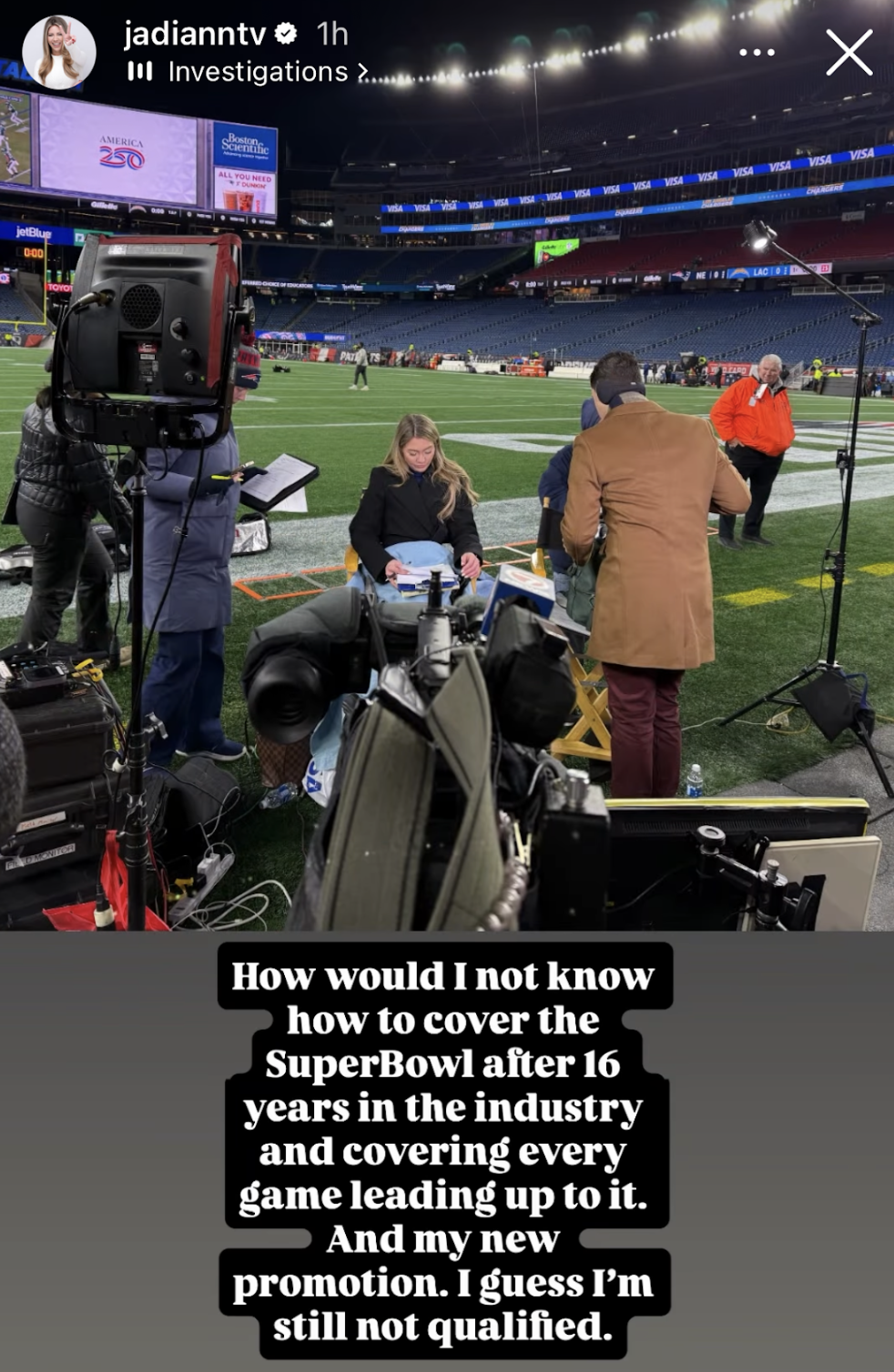/WHDH (Boston) Anchor Jadiann Thompson went on social media to publicly whine that her station did not send her to the Super Bowl.