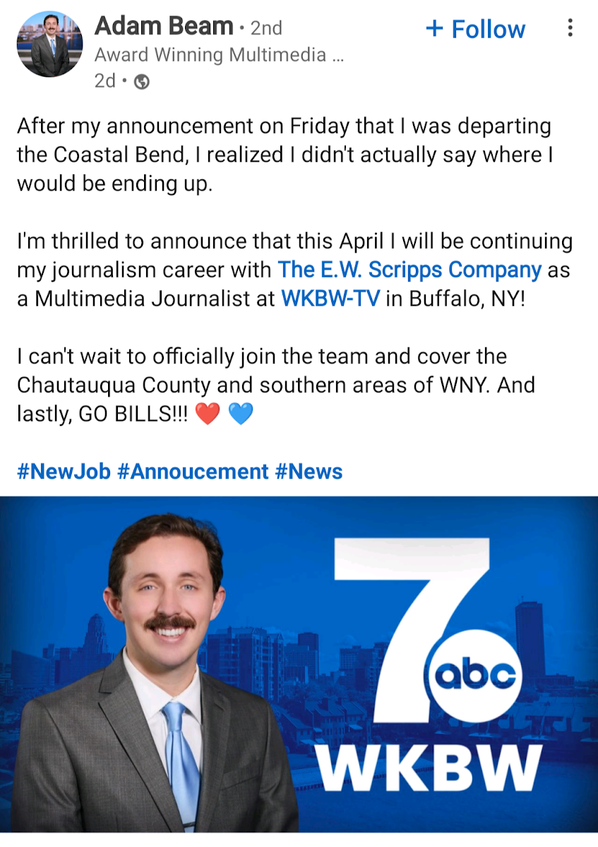/Adam Beam signed off from Scripps-owned KRIS (Corpus Christi) and he is headed to another Scripps station.
