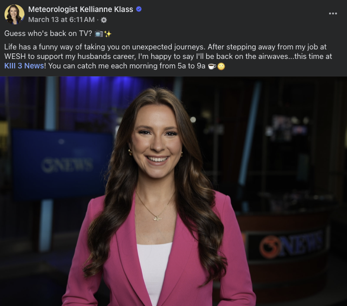 FTVLive told you in September of last year that WESH Met Kellianne Klass was leaving the Hearst station.