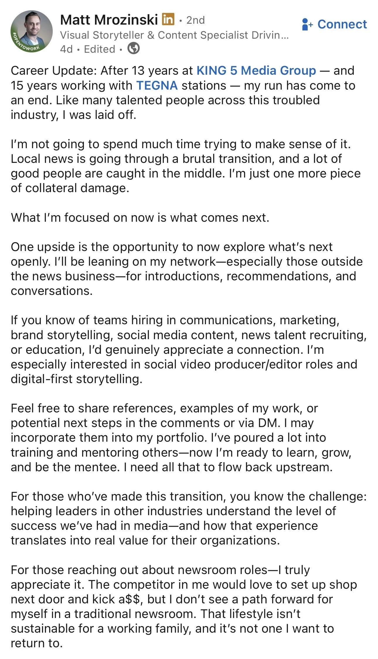 Matt Mrozinski was the Chief Photographer (or as Tegna calls it, Director of Visual Storytelling) at Tegna’s KING in Seattle.
