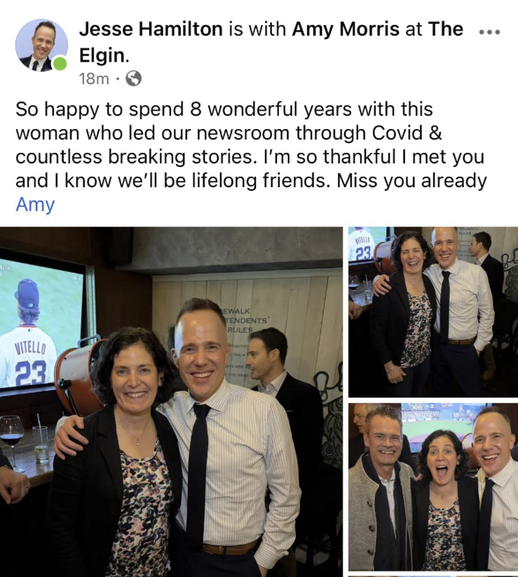 “At the end of January, WNBC/WNJU eliminated the positions of a dozen people. Producers, writers, assignment desk, most of the sports department. Senior management at the time (so… Amy Morris) told managers not to reach out to the impacted employees after they left. That means having no contact with people they’ve known and worked with for 5, 10 years… in some cases even longer,” said the station insider, adding, “But tonight, five days after Amy Morris’ position was eliminated, some of those same managers (pictured below) were out at a party with her. It seems the no contact rule doesn’t apply.”
