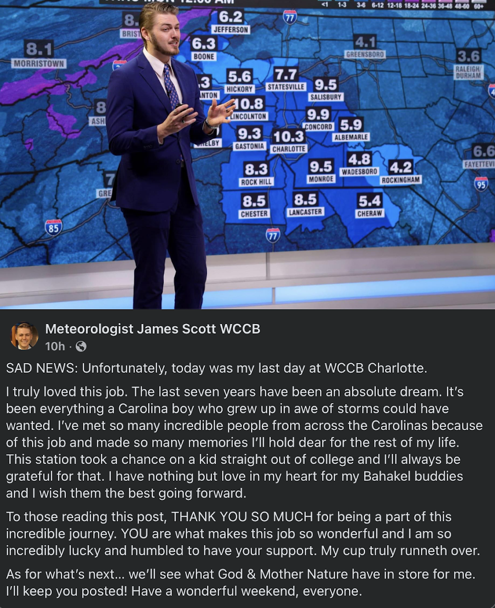Scott posted that he had worked his last day at the station. He joined WCCB straight out of school back in 2019, and worked the weekend shift.