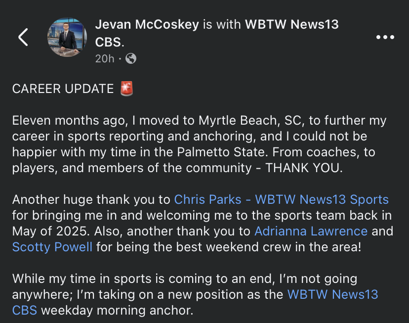 /Jevan McCoskey took a job at WBTW (Myrtle Beach) just under a year ago, covering sports.