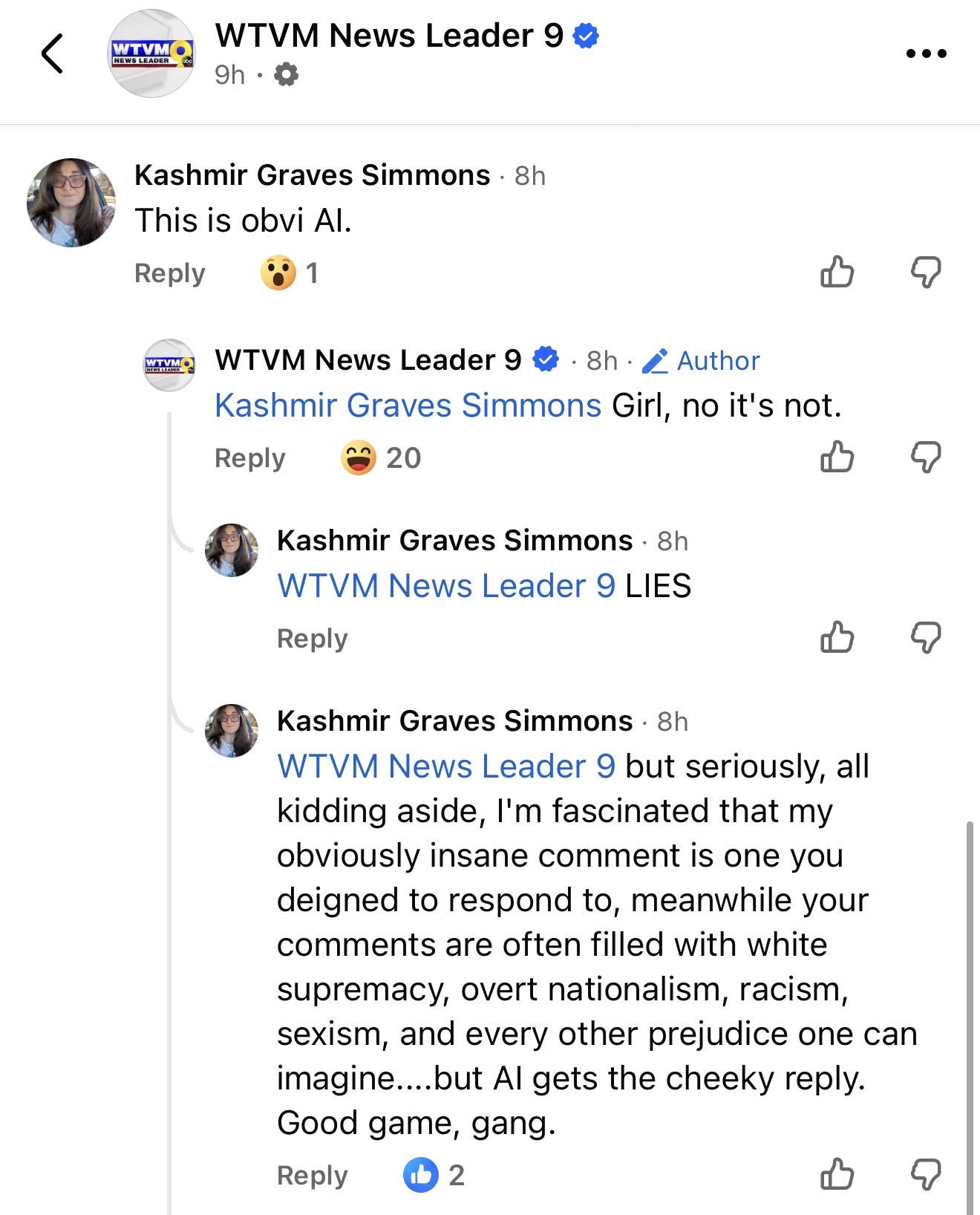 The station did not comment on any of those posts, but when one woman commented, saying it looked like AI, WTVM thought it was okay to refer to the woman as a “girl.”