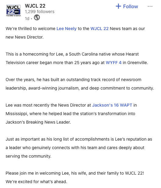 /Hearst Television announced they have hired a new News Director for WJCL in Savannah.