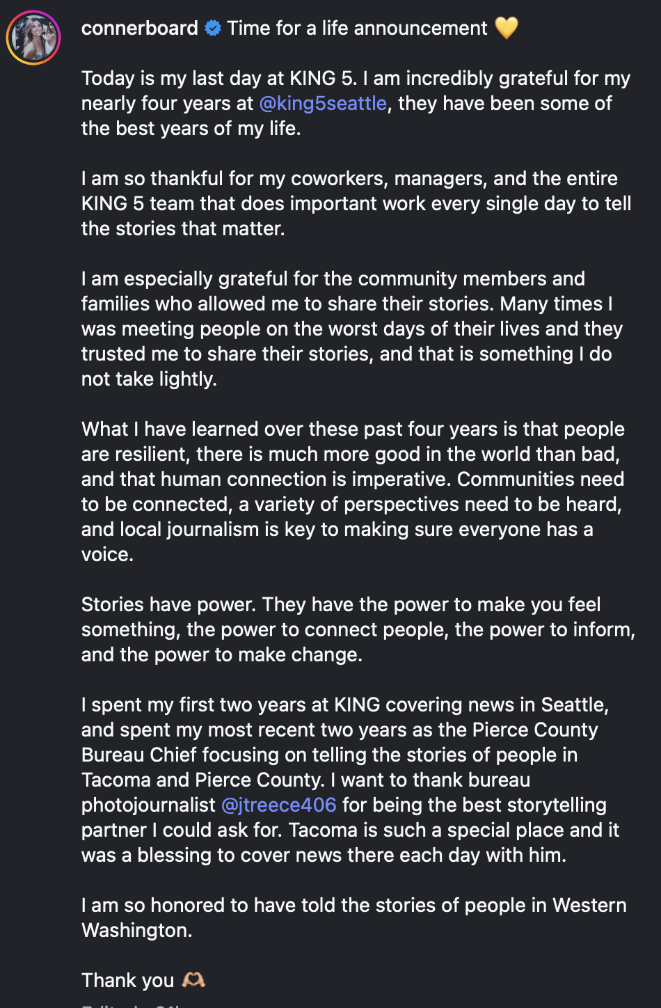 /Another Tegna (maybe soon Nexstar) talent has left the station. KING (Seattle) Reporter Conner Board posted that she has worked her last day at the station.