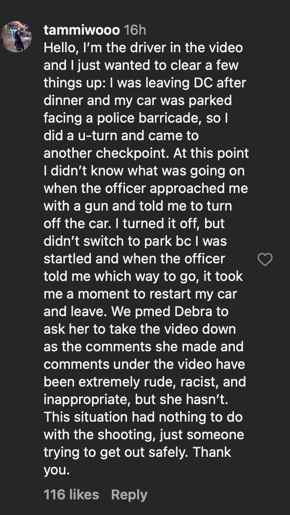 /Debra Lea, who is a political commentator, who has appeared on Fox News and other places, posted a video of cops approaching a car near the Hilton hotel in DC, where the WHCD was held.