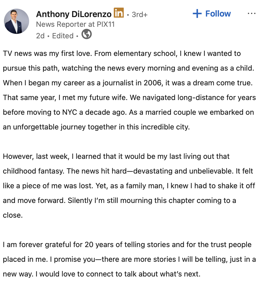 /For over a decade, Anthony DiLorenzo was living out his dream reporting in New York for WPIX.
